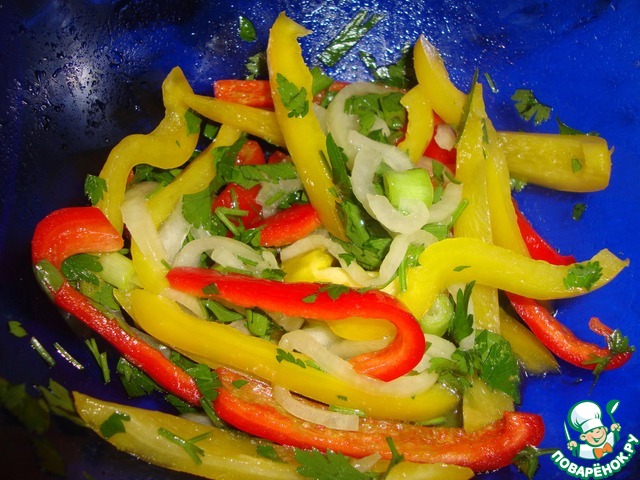 Нашинковать болгарский перец соломкой, добавить к перцу половину маринованного лука, сдобрить 1 ст. ложкой заправки, подсолить по вкусу и сервировать на чистую тарелку. Присыпать салат сверху рубленной петрушкой.
