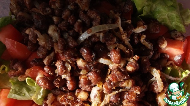 Пока обжариваются лук с фасолью, рвем листья салата на небольшие части.