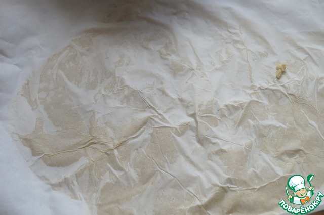 Затем достанем кракелюрное тесто и раскатаем его в тонкий пласт около 1 мм между двумя листами пергамента. Снова уберем в морозильник на 15 минут. Затем достанем и положим в холодильник.