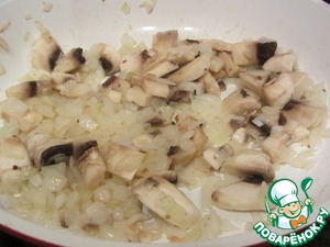 Добавляем в сковороду шампиньоны и обжариваем еще 3-5 минут, помешивая.