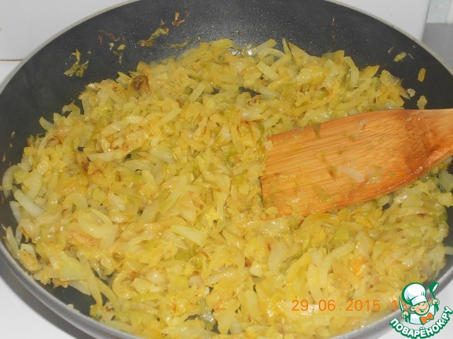 • Капусту мелко нашинковать и обжарить с луком до готовности, посолить