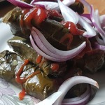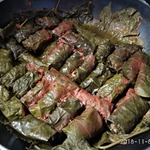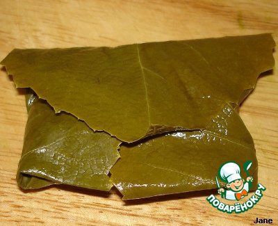 Чайной ложкой выложить фарш на листья, свернуть конвертиком.