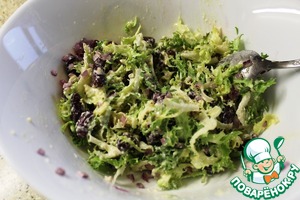 В миске смешиваем фасоль, салатные листья, лук и давленный чеснок.