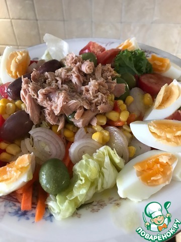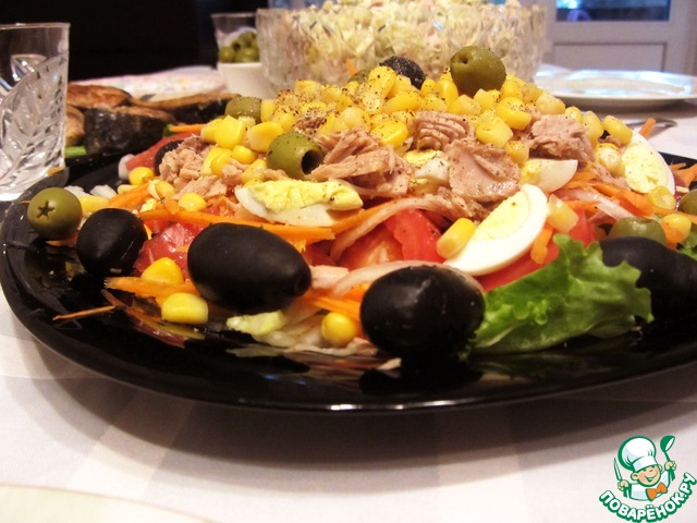 Затем консервированный тунец и сладкая кукуруза. Внимание - тунца надо совсем немного - не больше столовой ложки на порцию.