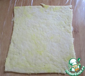 Достать тесто из холодильника, и поделить на три части. Каждую часть раскатать и обрезать неровные края до формы прямоугольника. (Жёлтенькие полосочки-это я в отчаянии сыпанула куркумы в уже замешенное тесто)))