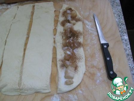 Раскатать тесто в прямоугольник, подсыпая муку на доску, нарезать на полоски шириной 6-7 см. На одну полоску выложить порезанные груши по 2 кусочка в ряду, до конца полоски. Посыпать груши через мелкое ситечко корицей, а сверху посыпать сахаром.