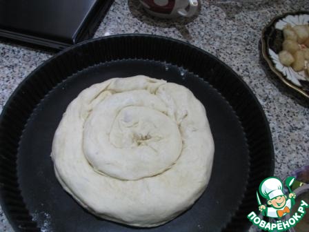 Выложить в форму начиная с центра в виде улитки, швом вниз.