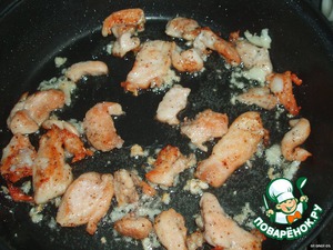 Чеснок выдавить через пресс, добавить к куриному филе и жарить еще 1 минуту.