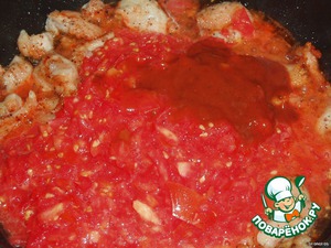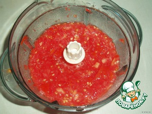 Помидоры я измельчила. По рецепту с них полагается снять кожицу (сделать надрез крест-накрест, опустить на минуту в кипяток), но меня не напрягают кусочки кожицы помидоров в готовом блюде.