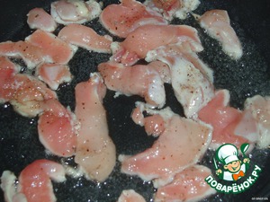 Куриное филе вымыть, обсушить, нарезать небольшими кусочками, посыпать солью и перцем.