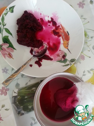 Теперь займемся "красками" для спагетти. Отварную свеклу почистить, натереть на терке и отжать через 4 слоя марли или бинта сок. Это у нас получится красная "краска".