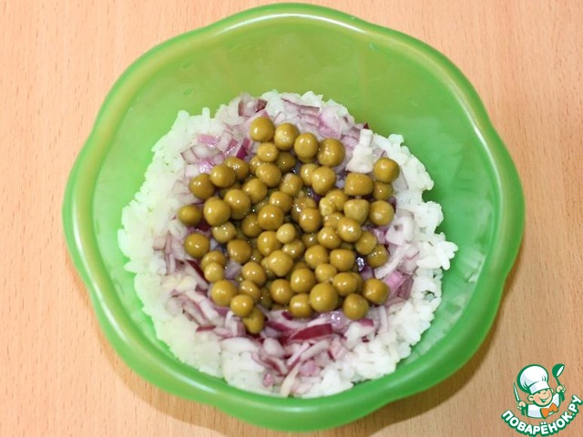 Нарезанные лук и зеленый горошек поместить в небольшую емкость, добавить рис и перемешать.