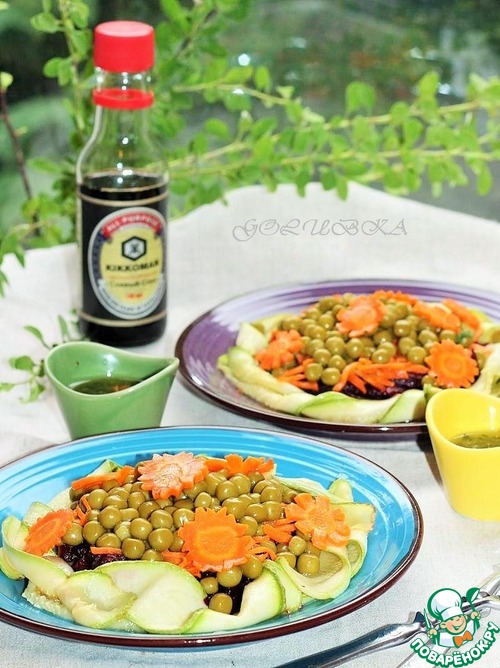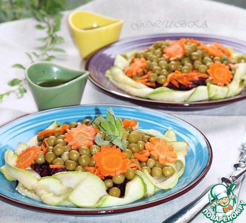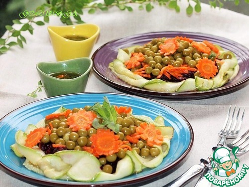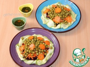 Затем выложить зеленый горошек, полить оставшейся заправкой и украсить листьями мяты и небольшими ломтиками моркови.