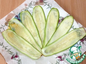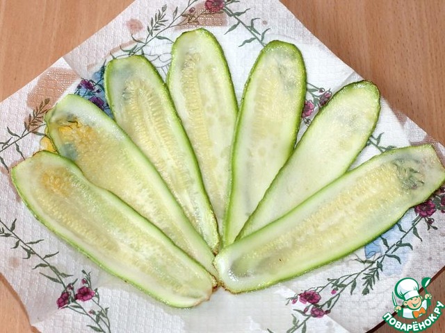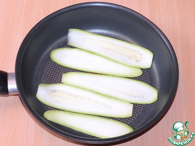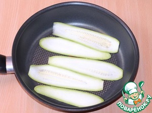 Кабачки, не очищая, нарезать длинными тонкими полосками и слегка обжарьте на оливковом масле, на разогретой сковороде. Не солим!
