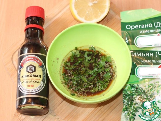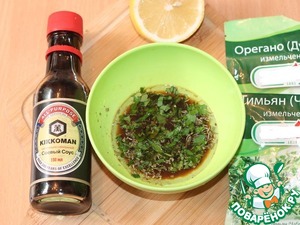 Приготовить ЗАПРАВКУ для салата: поместите в небольшую миску лимонный сок, орегано, тимьян, петрушку, измельченную мяту, немного сахара и щепотку соли. Быстро взбейте, чтобы все соединить. Тонкой струйкой влейте оливковое масло и соевый соус, перемешайте.