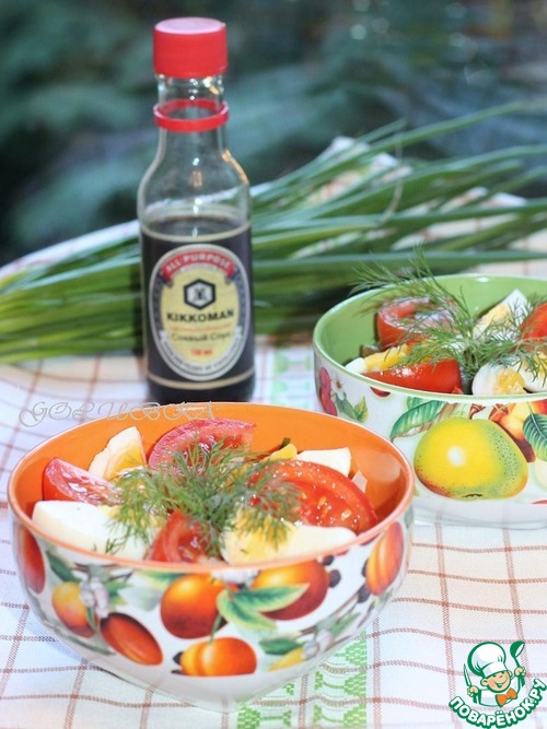 и заправляем получившимся соусом салат. Оставляем на пятнадцать минут для пропитки. Отваренные яйца разрезаем дольками, украшаем салат и подаем к столу.