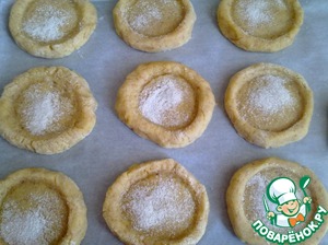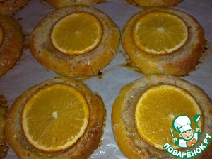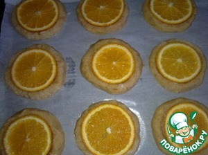 Края печенья смажьте взбитым желтком. Положите в образовавшееся углубление кружок апельсина и посыпьте сахаром. Разогрейте духовку до 180 градусов. Поставьте противень в духовку и выпекайте печенье 15-20 минут.