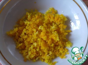 К взбитой массе из масла и яиц, добавьте молотый миндаль, сахар, муку и цедру апельсина, влейте апельсиновый сок и быстро перемешайте.