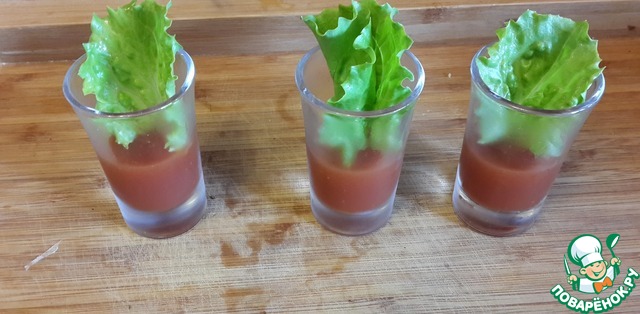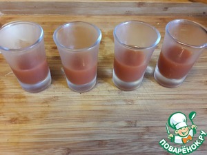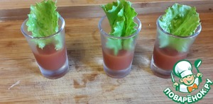 Желатин замачиваем в воде до набухания, нагреваем его до растворения (не доводя до кипения) и смешиваем с томатным соком
