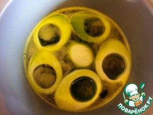 Яйца варим вкрутую, очищаем. Разрезаем вдоль. Желток удаляем, перекладываем его в отдельную тарелку. Шпинатный сок нагреваем почти до кипения. В горячий сок опускаем белки яиц и оставляем там на 1 час. Они окрасятся в бледно-салатовый цвет.
