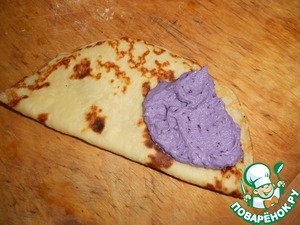 Блинчики сложить пополам, на 1/2 половинки выложить черничный крем.