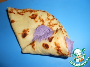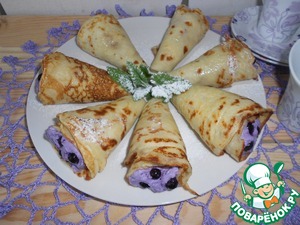 Вкусные и очень нежные блинчики с начинкой из черники и рикотты. благодаря соку черники, начинка получилась нежного чернично-лилового цвета. Вкусно и красиво.