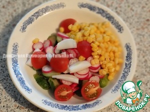 В тарелку выложить капусту, редис - кружочками, лук - дольками;