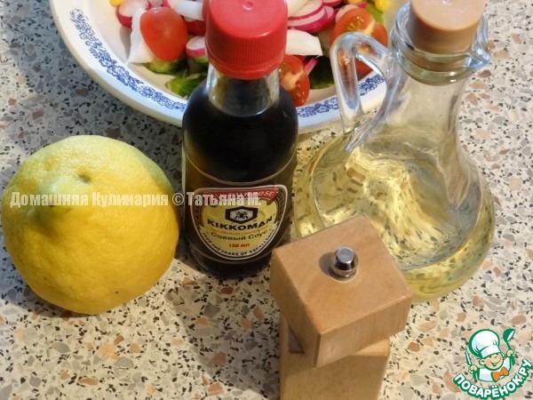 Сбрызнуть салат лимонным соком, заправить смесью масла и соевого соуса, поперчить - размешать;