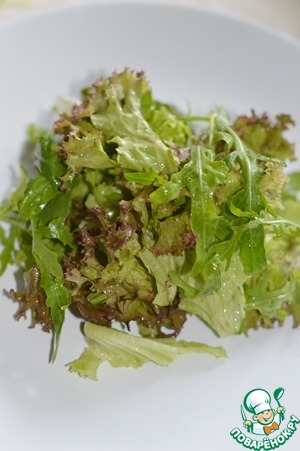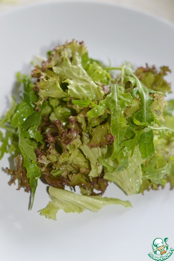2. Салатный микс вымыть, обсушить. Выложить на тарелку.