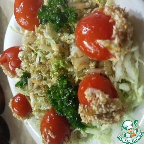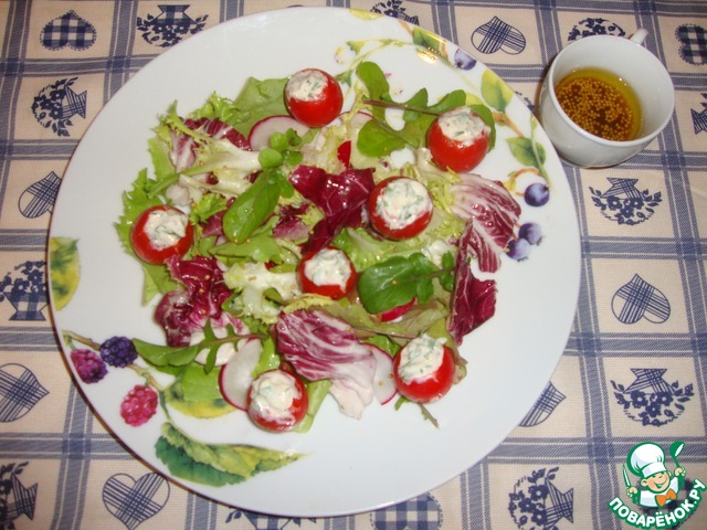4. На салат выложить фаршированные помидоры и полить заправкой.