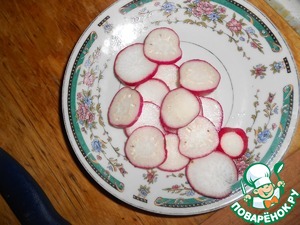Моцареллу нарезать кружочками и выложить на овощи. -