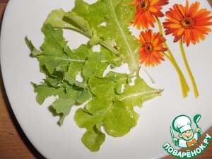Листья салата вымыть, обсушить и выложить на блюдо.