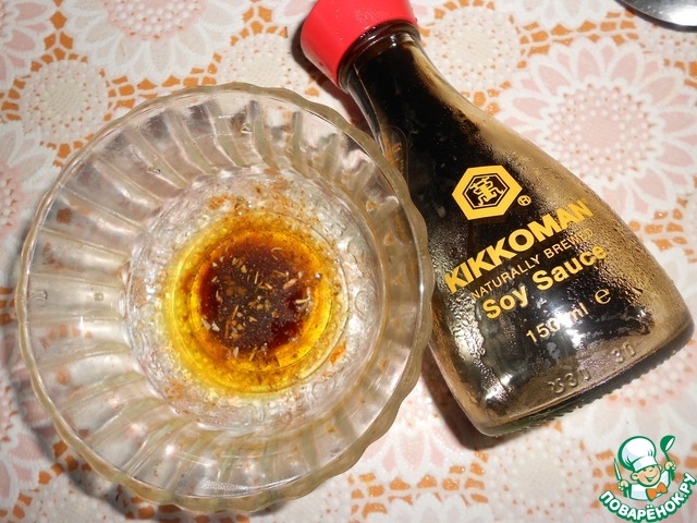 Приготовить заправку- соединить оливковое масло, соевый соус Киккоман, добавить щепотку перца чили и орегано. Взбить.