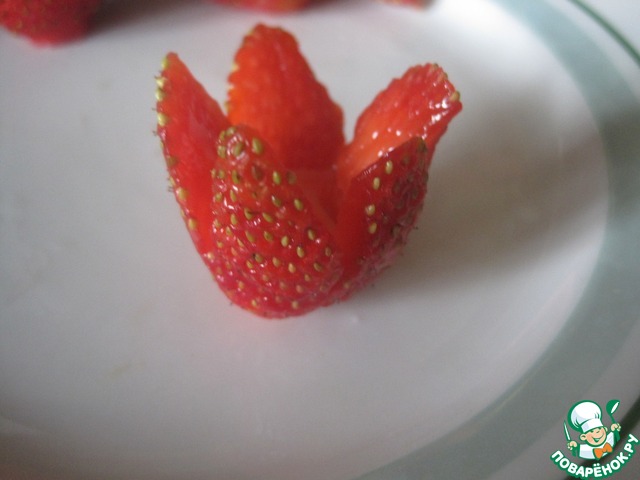 Из клубники вырезаем цветок, посередине отсаживаем творожный сыр из кондитерского мешка