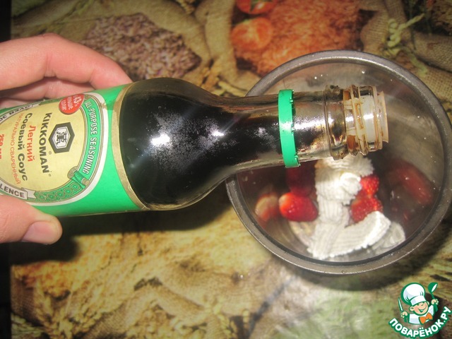 Готовим заправку для салата. Измельчаем в блендере клубнику, творожный сыр, растительное масло, соевый соус, мед. Получается густая, ароматная, нежно-розовая заправка