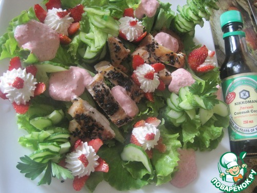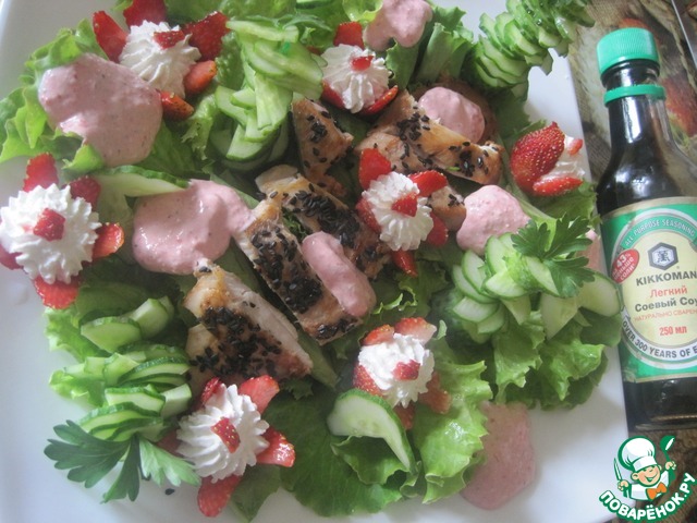 Вроде бы, совершенно не сочетаемые на первый взгляд продукты, в результате дают пикантный и необыкновенный вкус. Оказывается, в салате могут интересно сочетаться и салатная зелень, и кисло-сладкая клубника, и нежный вкус творожного сыра, и даже обжаренного куриного филе и свежих огурцов, заправленные соево-медовым соусом
