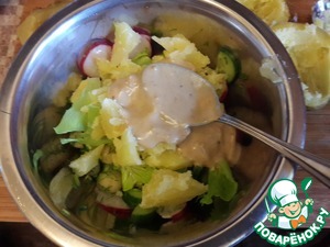 Положить теплую мякоть картофеля в салат, вылить заправку и перемешать