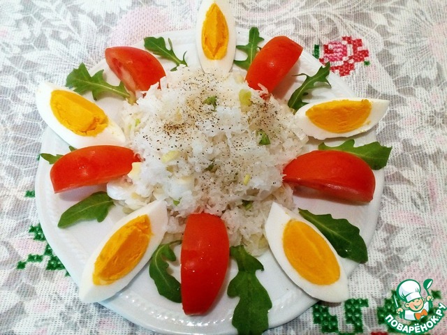 Измельчите зеленый лук. Нарезанные продукты уложите на тарелку и полейте приготовленным соусом. Подавайте салат охлажденным, оформите зеленью. Угощайтесь!