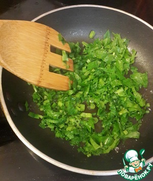 Половину шпината мелко рубим и тушим в сковороде буквально 1 минуту с 1 ст. л. воды