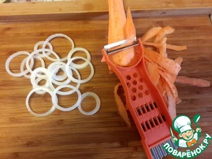Лук нарезаем кольцами, морковь с помощью овощечистки нарезаем на тоненькие пластики