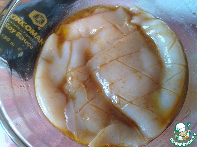 В пиалу с маринадом выкладываем тушки кальмаров и хорошо натираем их маринадом. Оставляем кальмаров мариноваться на 2 часа.