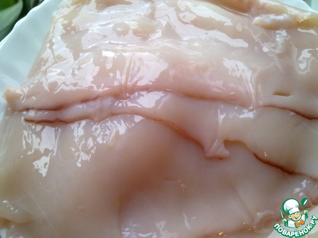 Каждый разрезанный кальмар надрезаем сеточкой неглубоко.