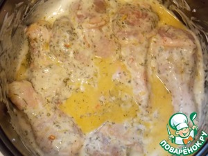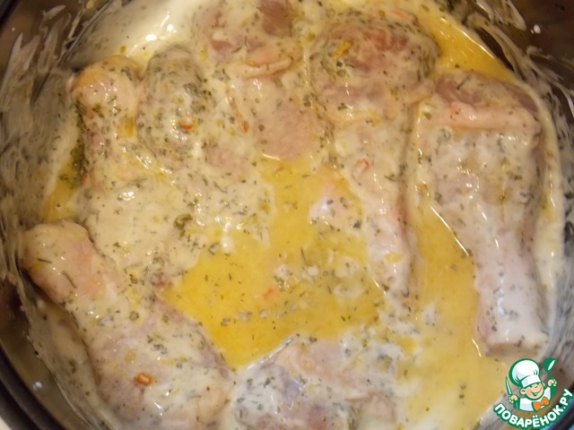 Голень промыть, положить в чашу. Посолить, влить йогурт, насыпать петрушку и влить сок. Все перемешать и поставить на 90 мин. в режим "ТУШЕНИЕ".
