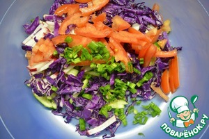 помидоры (предварительно освободив их от семян). Лук мелко порезать и добавить к овощам.