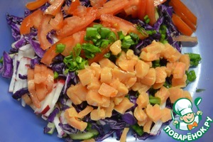 Легкий, интересный и очень вкусный салатик с овощами и красной рыбкой, заправленный оливково-соевым соусом!