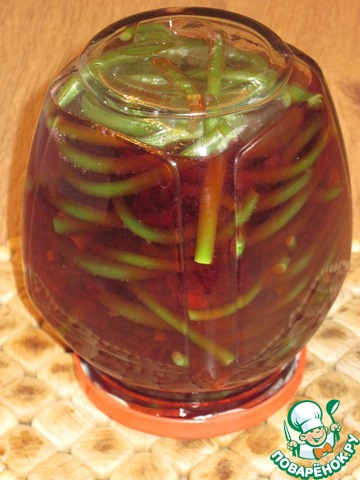 Приятного цвета маринад, пикантного вкуса стрелки подают к мясу, рыбе, с овощами.