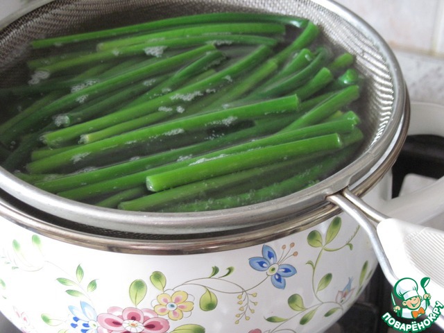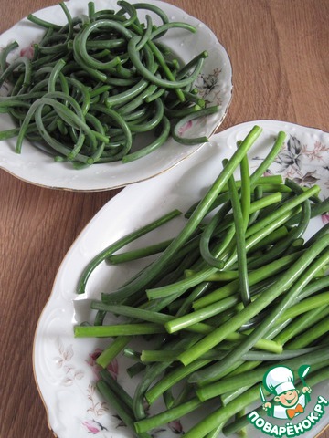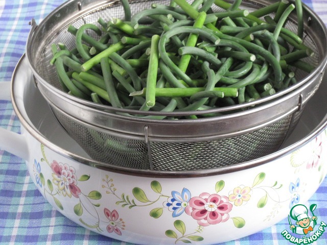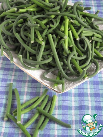Чесночные стрелки помоем, нарежем на кусочки нужной длинны.