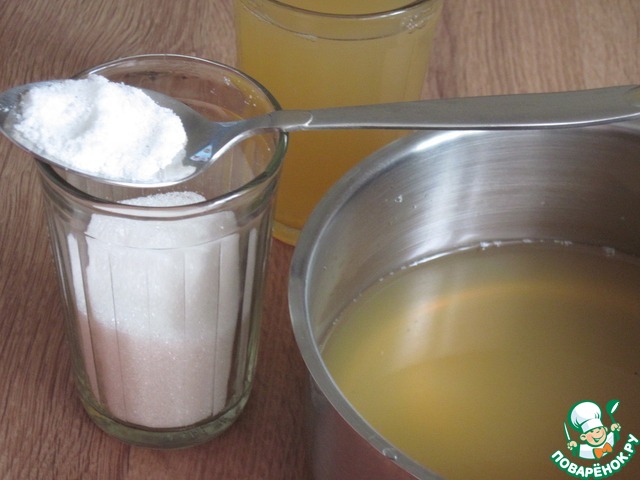 Приготовим маринад из сока, сахара, соли. Кипящим маринадом зальем уложенные в банки чесночные стрелки, закатаем крышками, перевернем и оставим до полного остывания.