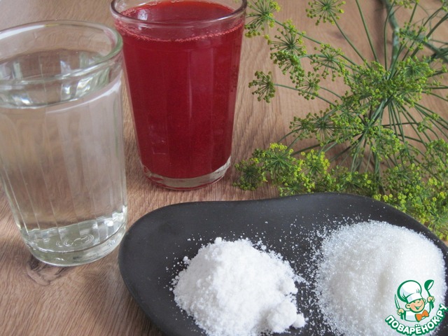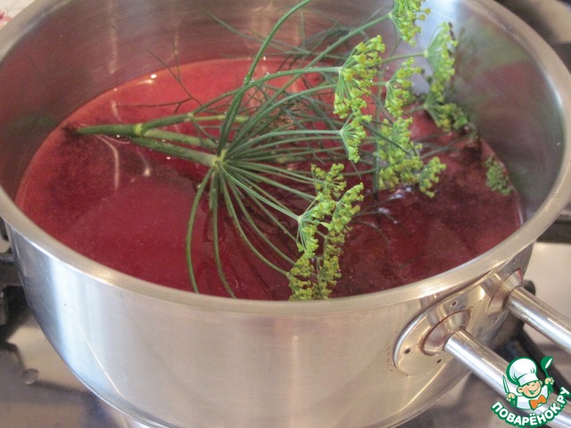 Приготовим маринад из сока красной смородины, воды, соли, сахара с добавлением зонтиков молодого укропа. Доведем до кипения.