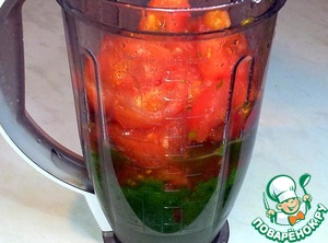 Из помидоров выжать сок и добавить в блендер, взбить ещё раз. Можно нарезанные помидоры загрузить в блендер и измельчить таким образом. Получился густой смузи.